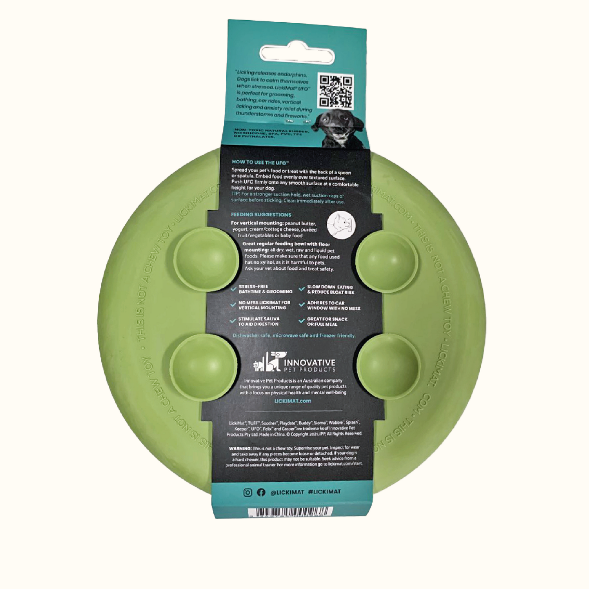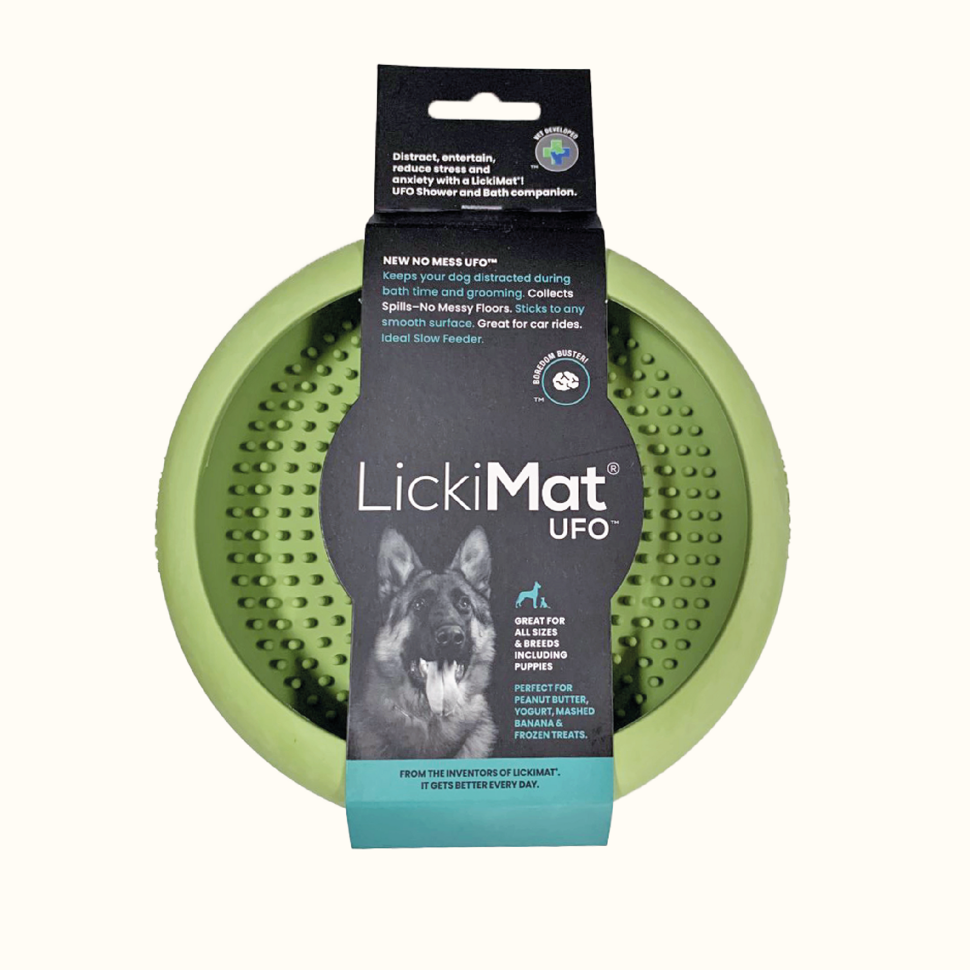 The LickiMat UFO is designed to effortlessly combine wet, raw and liquid food or treats with high sides to contain mess. The UFO has 7 large suction cups on the base allowing it to be used on a vertical surface. The UFO is ideal for a multitude of situations such as: providing a distraction during bathing or grooming, a mess free solution for feeding away from home, sucker to the car window to relieve travel anxiety or even sticking to a hard floor for particularly enthusiastic lickers. Dishwasher safe for easy clean up.
