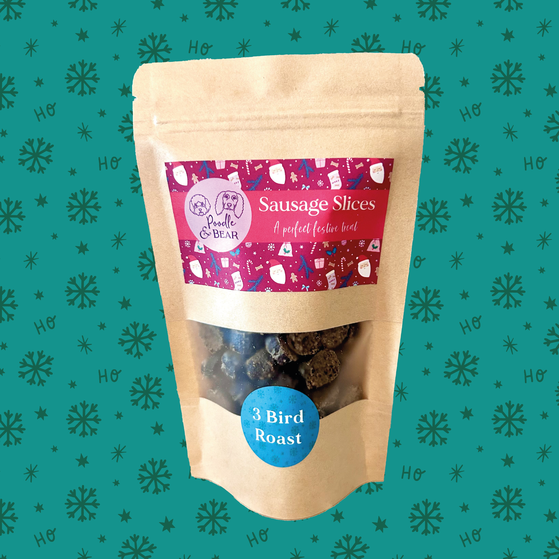 Gourmet sausage slices. A lovely way to get your dog involved in the Christmas spirit and an ideal gift for doggy pals. Soft enough to be broken into smaller pieces if desired.